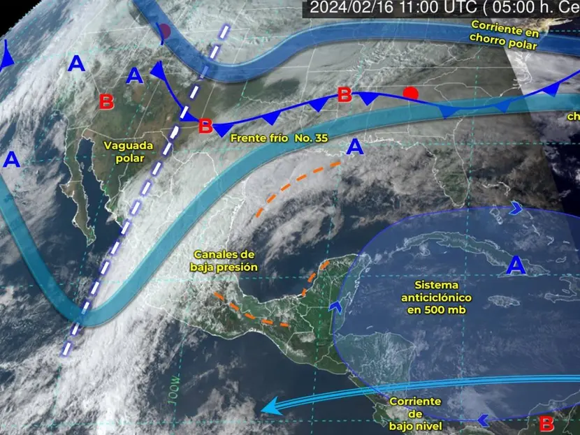 De acuerdo con el pronóstico del SMN, el frente frío 35 se desplazará rápidamente sobre la vertiente del Golfo de México, en interacción con una vaguada polar que cruzará el noreste, centro y oriente de la República Mexicana.